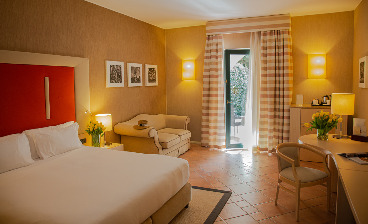 Le camere dell'Acaya Golf Resort & Spa sono elegantemente arredate e progettate per garantire il massimo del comfort. Ogni camera è dotata di moderni comfort come aria condizionata, connessione Wi-Fi gratuita, TV-Sat e un kit per la preparazione di tè e caffè. Con opzioni che vanno dalle Camere Comfort alle Camere Deluxe, queste sistemazioni offrono viste magnifiche sul campo da golf o sui giardini curati, con alcune disponibili anche per ospiti diversamente abili, assicurando così un'accoglienza inclusiva e attenta per tutti i visitatori.