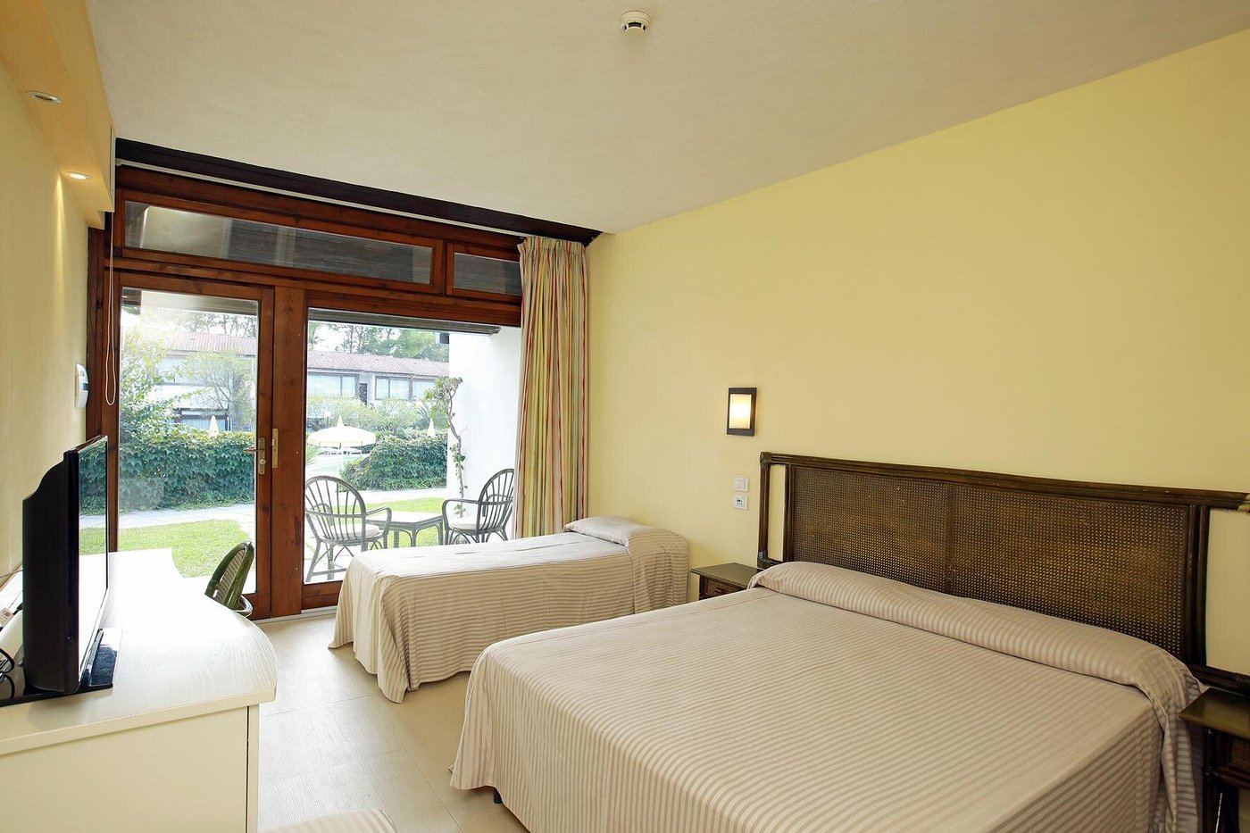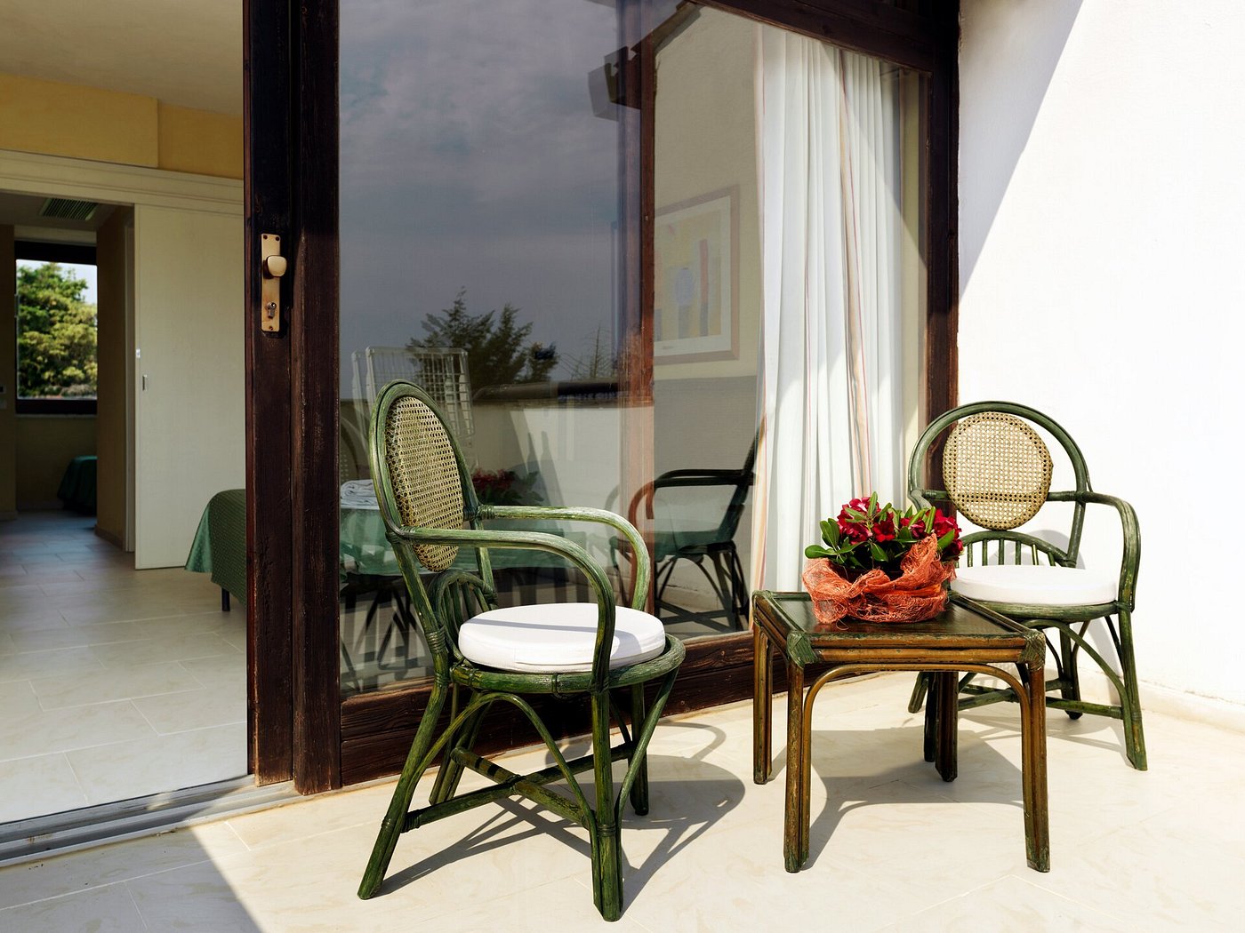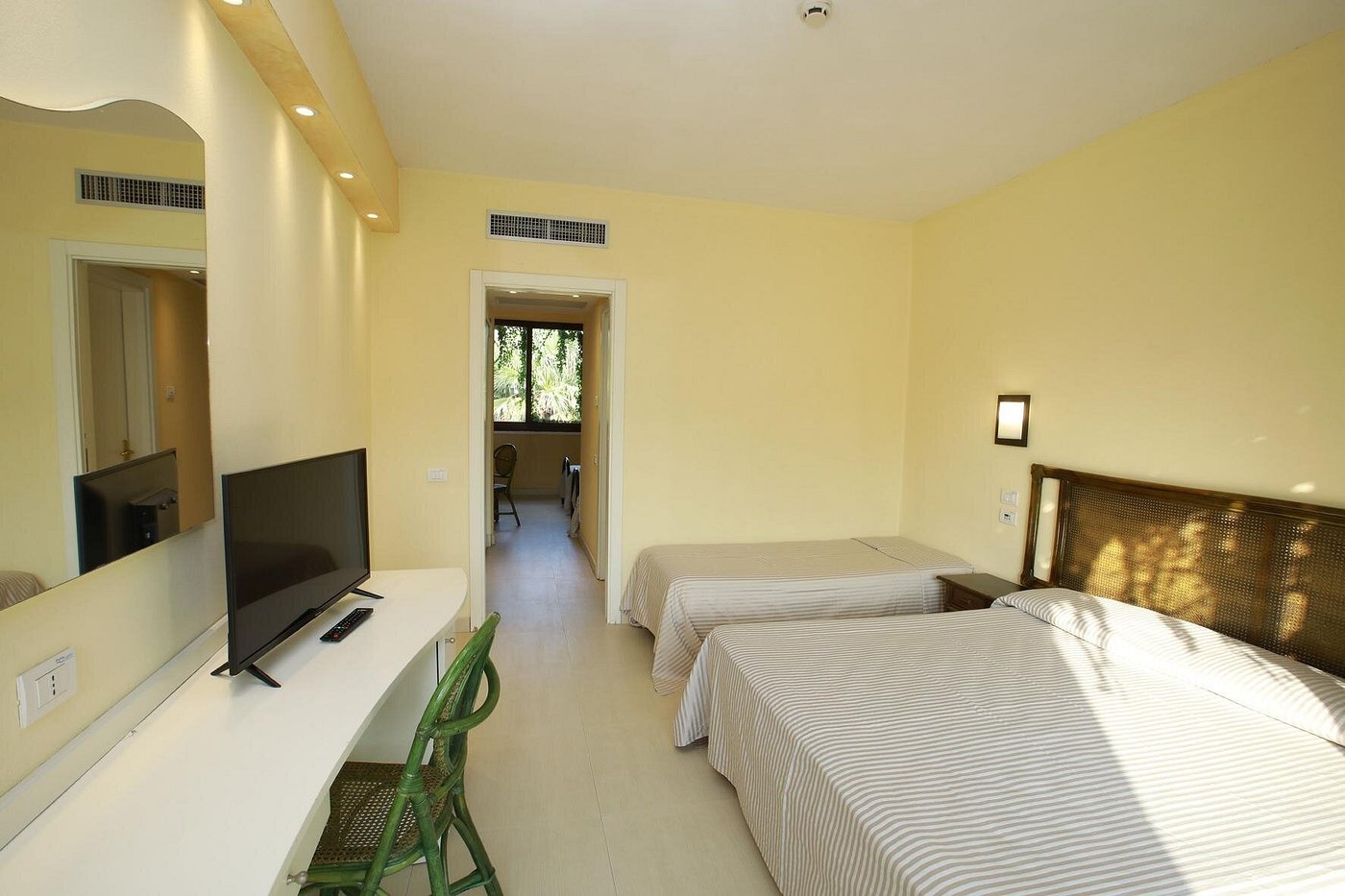 Camere Comfort: Ospitano da 1 a 4 persone, recentemente ristrutturate e situate principalmente al piano terra con porta finestra nei corpi laterali (vista piscina relax, vista pineta, lato mare). Dispongono di aria condizionata, bagno con doccia e asciugacapelli, porta-valigia, telefono con linea interna ed esterna, TV satellitare, cassetta di sicurezza digitale, minifrigo e patio.