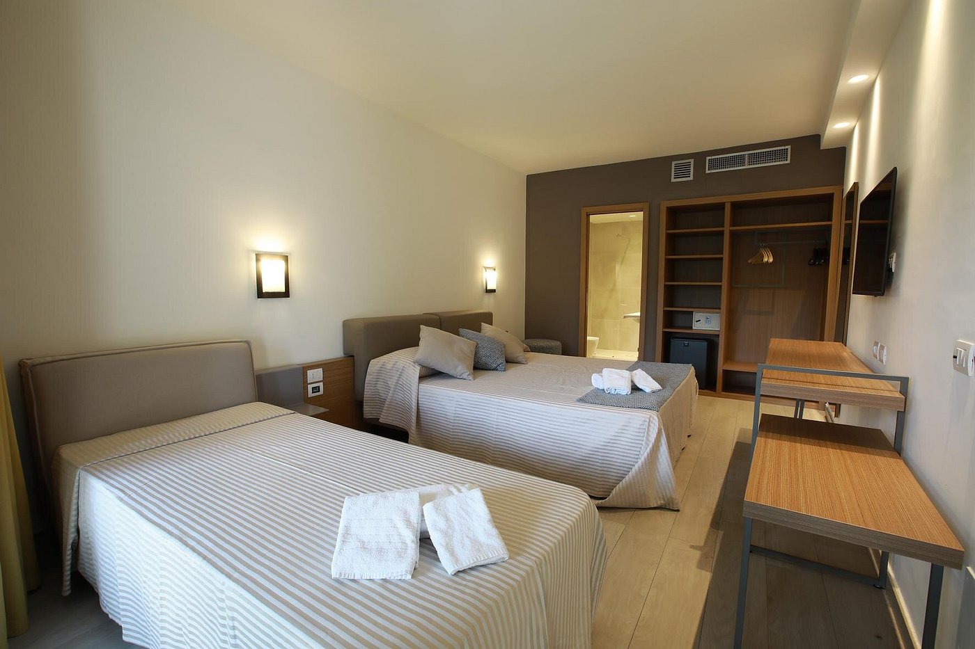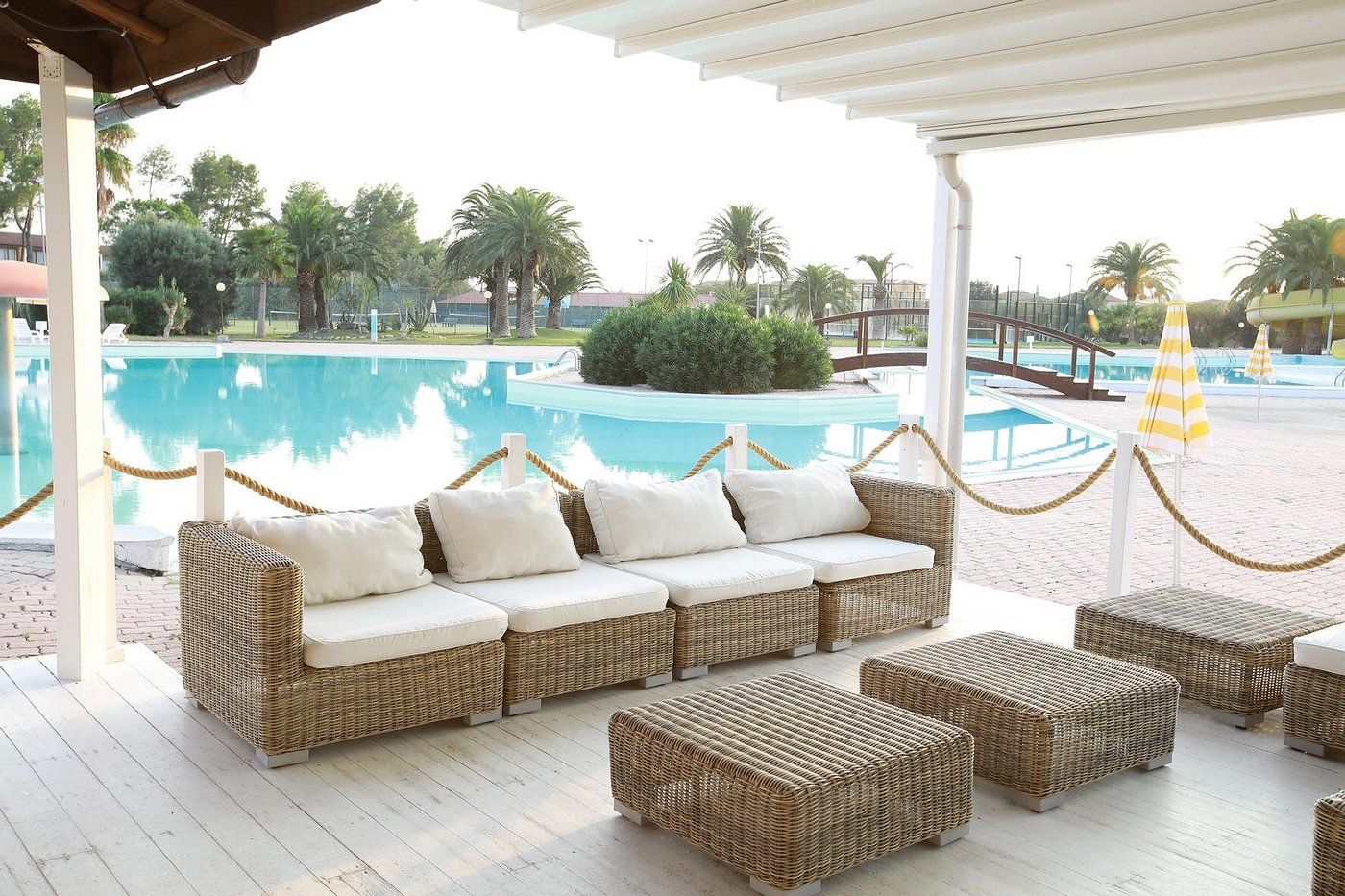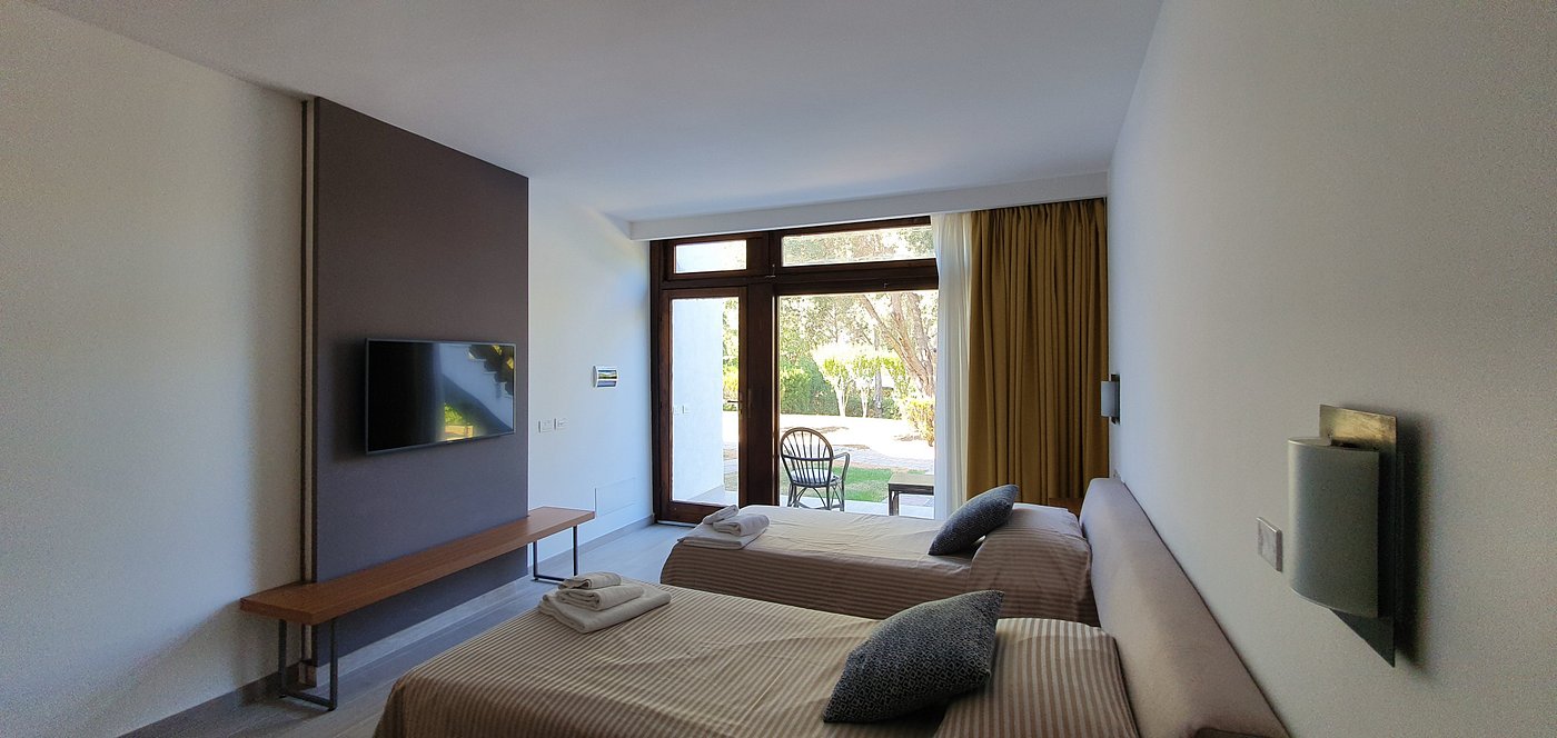 Camere Comfort: Ospitano da 1 a 4 persone, recentemente ristrutturate e situate principalmente al piano terra con porta finestra nei corpi laterali (vista piscina relax, vista pineta, lato mare). Dispongono di aria condizionata, bagno con doccia e asciugacapelli, porta-valigia, telefono con linea interna ed esterna, TV satellitare, cassetta di sicurezza digitale, minifrigo e patio.