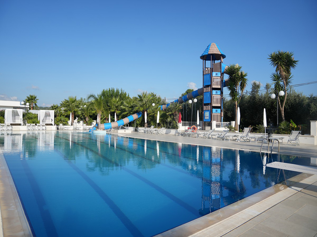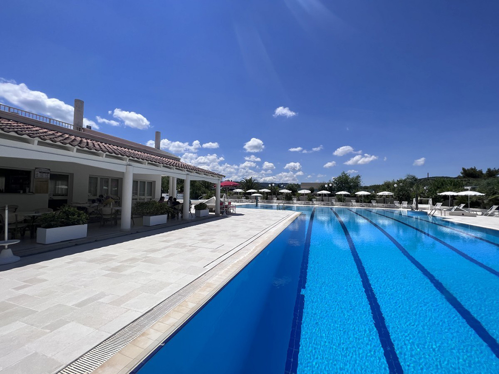 Il villaggio è composto da edifici a schiera immersi nel verde, su uno o due piani, con una zona principale dedicata a servizi e attività. Le camere hanno ingresso indipendente, bagno e veranda e includono TV, minibar, cassetta di sicurezza e asciugacapelli; l’aria condizionata è disponibile con supplemento. Sono presenti camere quadruple con letto a castello; alcune sistemazioni multiple possono avere angolo cottura senza supplemento (solo su segnalazione, non garantito) e poche camere doppio ambiente sono disponibili su richiesta con supplemento. La pulizia è giornaliera, con cambio asciugamani quando necessario e cambio biancheria letto settimanale (tre volte in caso di soggiorno di due settimane). La ristorazione propone cucina regionale e nazionale con prodotti freschi e a km 0: colazione continentale 07:30–09:30 (in alternativa al bar piscina senza supplemento), pranzo e cena serviti al tavolo; inclusi ½ litro d’acqua a persona ai pasti, altre bevande escluse. Su richiesta, prima fornitura di alimenti base per intolleranze con supplemento (non garantita assenza di contaminazioni). Tra i servizi: reception, bar, ristorante climatizzato, piscina con area bimbi, animazione e mini club, campo polivalente, Wi-Fi nelle aree comuni, parcheggio interno. Navetta per spiaggia convenzionata a 1.850 m. Animali non ammessi; check-in domenica 17:00–19:00, check-out domenica 10:00.