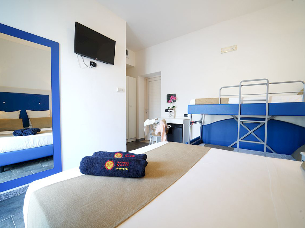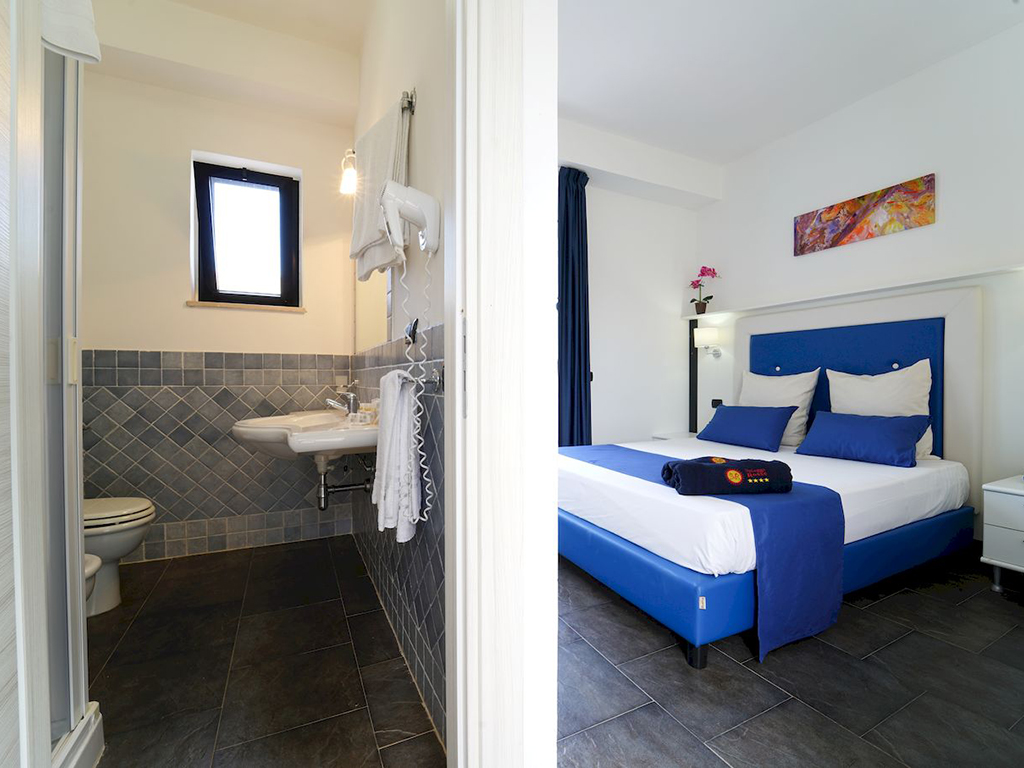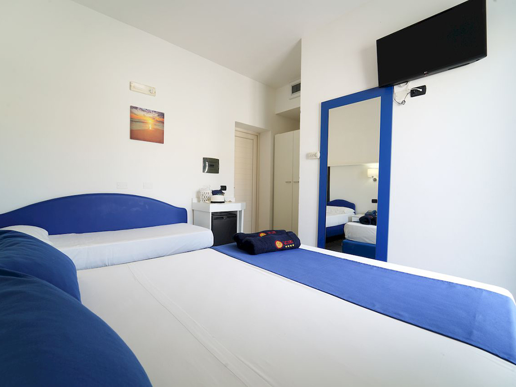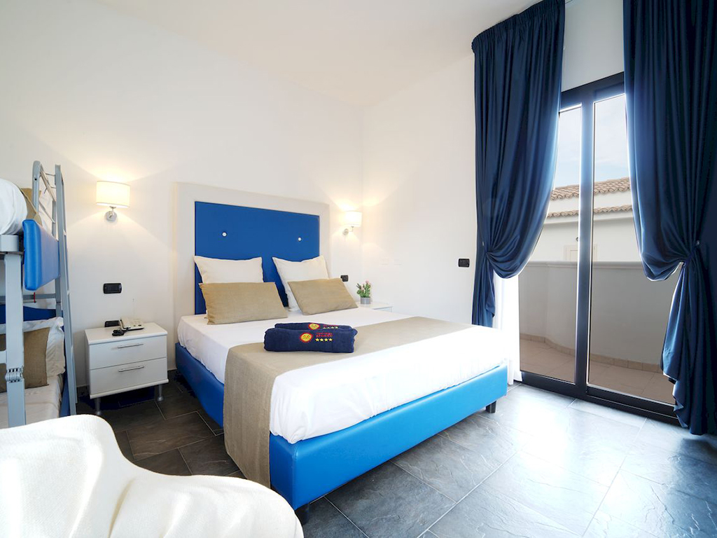 Le 90 camere dispongono di servizi privati con doccia e asciugacapelli, aria condizionata, mini-frigo, tv color solo satellitare e cassetta di sicurezza. Disponibili camere matrimoniale con possibilità di aggiunta su richiesta di culla; camera 3 letti, matrimoniale con aggiunta di letto singolo; camera 4 letti, matrimoniale con l'aggiunta di divano letto a castello o letto a castello per ragazzi fino a 14 anni. Le camere dispongono di piccolo patio se al piano terra (generalmente le camere doppie e camere a 4 letti) o con balcone se al primo piano (camere a 3 letti e camere a 4 letti). Le camere sono assegnate a discrezione della direzione tra piano terra e primo piano, lato parco o piscina, non è possibile scegliere la sistemazione se non con supplemento, previa disponibilità in fase di prenotazione.